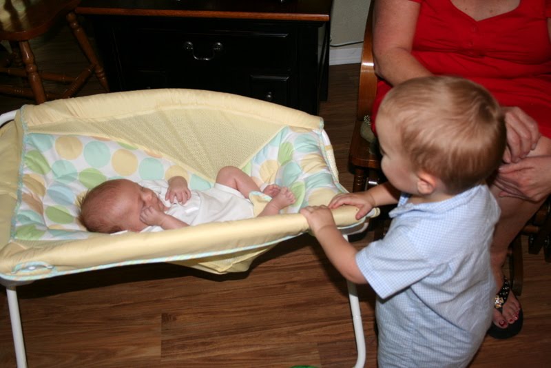 He made his first trip to Mecca yesterday. That's Target in case you were wondering. We needed a few items and lets face it... I think the economy was probably failing due to my lack of Target runs. I just wanted to do my part for the good ol' US of A. Things we needed--an inclined positioner for his cradle which he isn't a fan of sleeping in, diapers (tried the up and up target brand... he poops and pees right through them. We're sticking with the pampers), nursing tanks--GOD SEND, and a new book for me. I think it's called the Menonite in a Black Dress or something close to that. He was a dream while we were out and only started screaming once we were almost home. I think he was sad when he realized we had left the store.